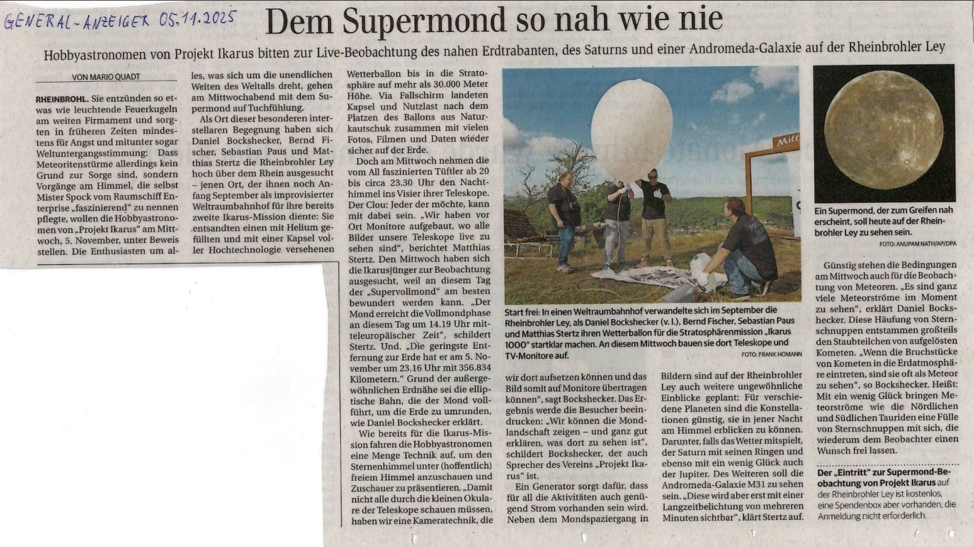 Die Vorankündigung zum Supermond-Event von Projekt Ikarus auf der Rheinbrohler Ley mit Projekt Ikarus.